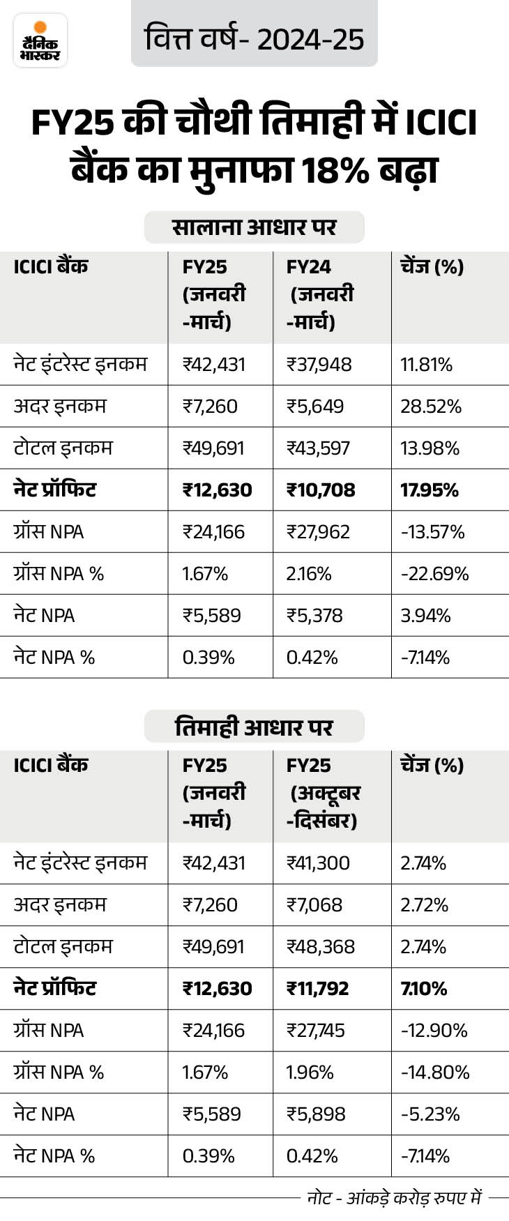 पिछले साल के जनवरी-मार्च तिमाही के मुकाबले ICICI बैंक का मुनाफा इस बार 18% ज्यादा रहा है। एक साल पहले की समान अवधि में बैंक ने 43,597 करोड़ रुपए की कमाई की थी। तब इसका मुनाफा ₹10,708 करोड़ रहा था। बैंक ने इस बार बेहतर काम किया।