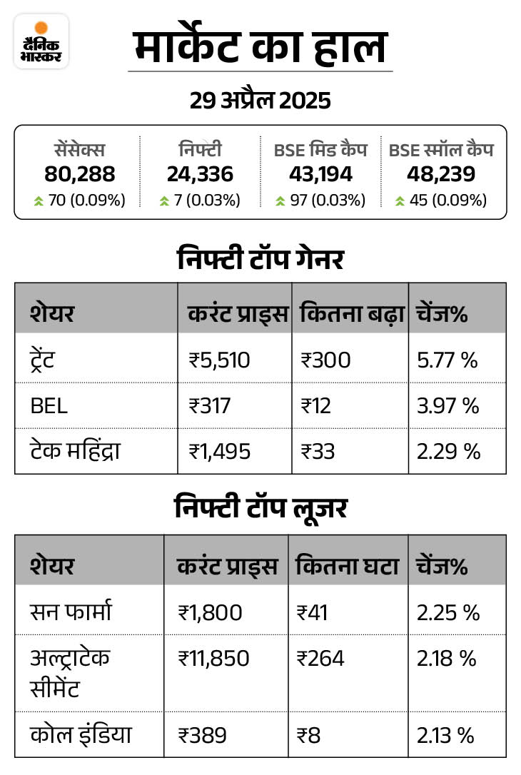 हफ्ते के दूसरे कारोबारी दिन यानी कल (29 अप्रैल) को शेयर बाजार फ्लैट कारोबार रहा। सेंसेक्स 70 अंक चढ़कर 80,288 के स्तर पर बंद हुआ। निफ्टी में 7 अंक की तेजी रही, ये 24,336 पर बंद हुआ।