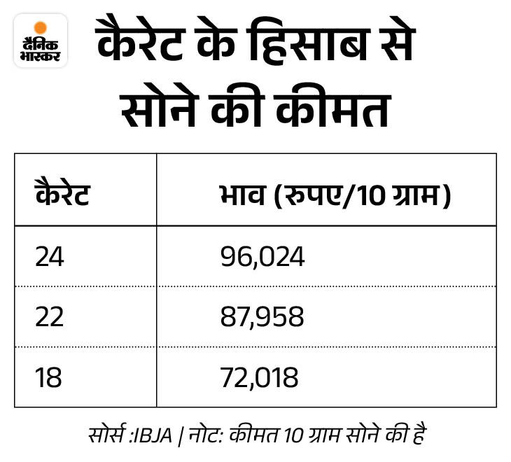- मुंबई : 10 ग्राम 22 कैरेट सोने की कीमत 91,300 रुपए और 10 ग्राम 24 कैरेट सोने की कीमत 99,600 रुपए है।