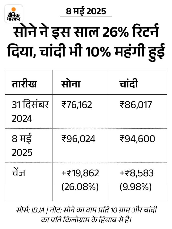वहीं, एक किलो चांदी की कीमत आज 1,174 रुपए गिरकर 94,600 रुपए प्रति किलो पर आ गई है। बुधवार को चांदी का भाव ₹95,774 प्रति किलो था। इससे पहले सोने ने 21 अप्रैल को ₹99,100 और 28 मार्च को चांदी ने ₹1,00,934 का ऑल टाइम हाई बनाया था।