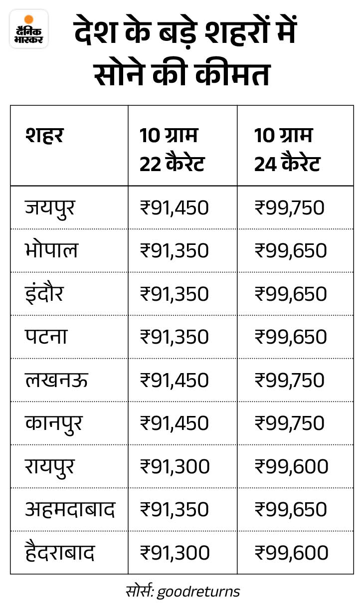 - दिल्ली : 10 ग्राम 22 कैरेट सोने की कीमत 91,450 रुपए और 10 ग्राम 24 कैरेट सोने की कीमत 99,750 रुपए है।