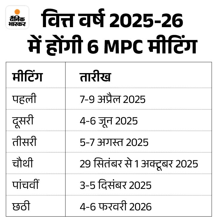 मॉनेटरी पॉलिसी कमेटी में 6 सदस्य होते हैं। इनमें से 3 RBI के होते हैं, जबकि बाकी केंद्र सरकार द्वारा नियुक्त किए जाते हैं। RBI की मीटिंग हर दो महीने में होती है। बीते दिनों रिजर्व बैंक ने वित्त वर्ष 2025-26 की मॉनेटरी पॉलिसी कमेटी की बैठकों का शेड्यूल जारी किया था। इस वित्तीय वर्ष में कुल 6 बैठकें होंगी। पहली बैठक 7-9 अप्रैल को हुई थी।