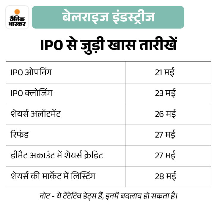 डीजल-पेट्रोल और इलेक्ट्रिक व्हीकल्स के कंपोनेंट बनाने वाली कंपनी बेलराइज इंडस्ट्रीज का IPO यानी इनिशियल पब्लिक ऑफरिंग 21 मई को ओपन हो रहा है। निवेशक इस इश्यू के लिए 23 मई तक बोली लगा सकेंगे। 28 मई को कंपनी के शेयर बॉम्बे स्टॉक एक्सचेंज (BSE) और नेशनल स्टॉक एक्सचेंज (NSE) पर लिस्ट होंगे।