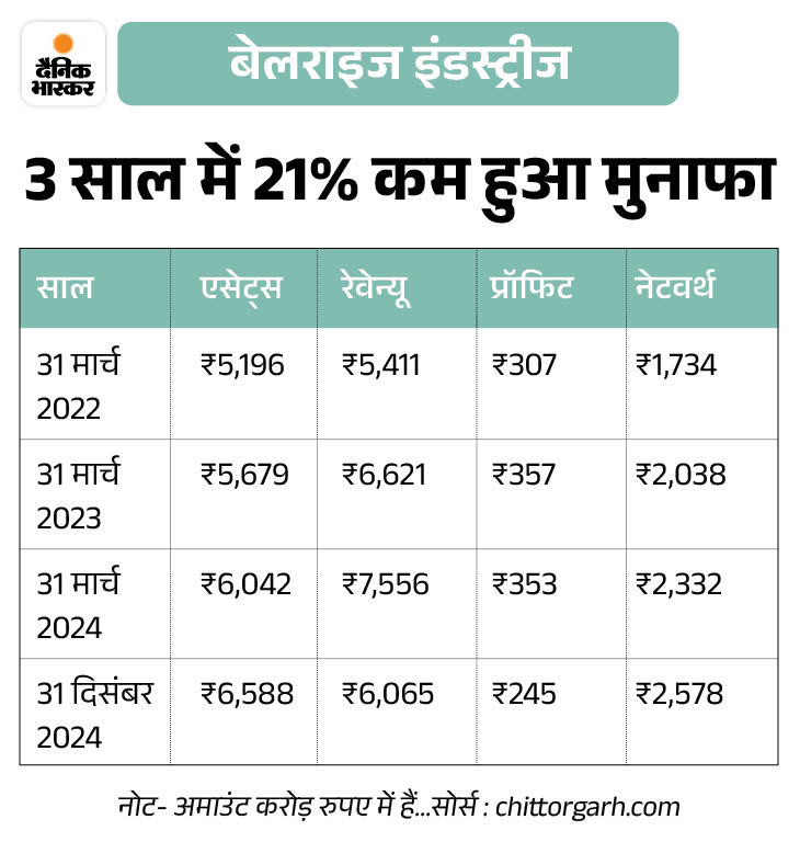 1996 में बनी बेलराइज इंडस्ट्रीज टू-व्हीलर, फोर व्हीलर, कमर्शियल और इलेक्ट्रिक व्हीकल्स के लिए कंपोनेंट बनाती है। कंपनी की भारत में टू-व्हीलर मेटल कंपोनेंट्स सेगमेंट में 24% हिस्सेदारी है। इस सेगमेंट में बेलराइज इंडस्ट्रीज बाजार की टॉप तीन कंपनियों में से एक है।