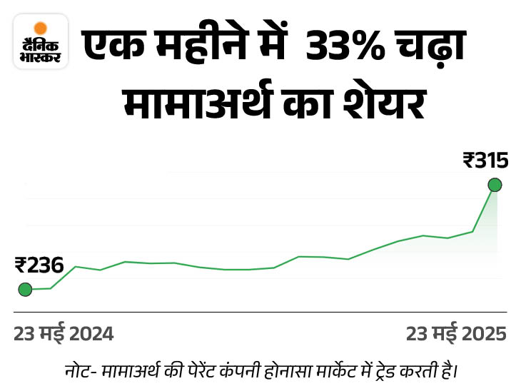 मामाअर्थ की पेरेंट कंपनी होनासा कंज्यूमर लिमिटेड के शेयर में आज यानी 23 मई को 16% से ज्यादा की तेजी है। ये 16.13% ऊपर 320 रुपए पर ट्रेड कर रहा है। शेयर में यह तेजी कंपनी के मजबूत तिमाही नतीजों की वजह से है।