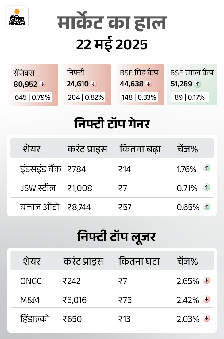 हफ्ते के चौथे कारोबारी दिन गुरुवार, 22 मई को शेयर बाजार में गिरावट रही। सेंसेक्स 645 अंक गिरकर 80,952 के स्तर पर बंद हुआ। निफ्टी में भी 204 अंक की गिरावट रही, ये 24,610 के स्तर पर बंद हुआ।