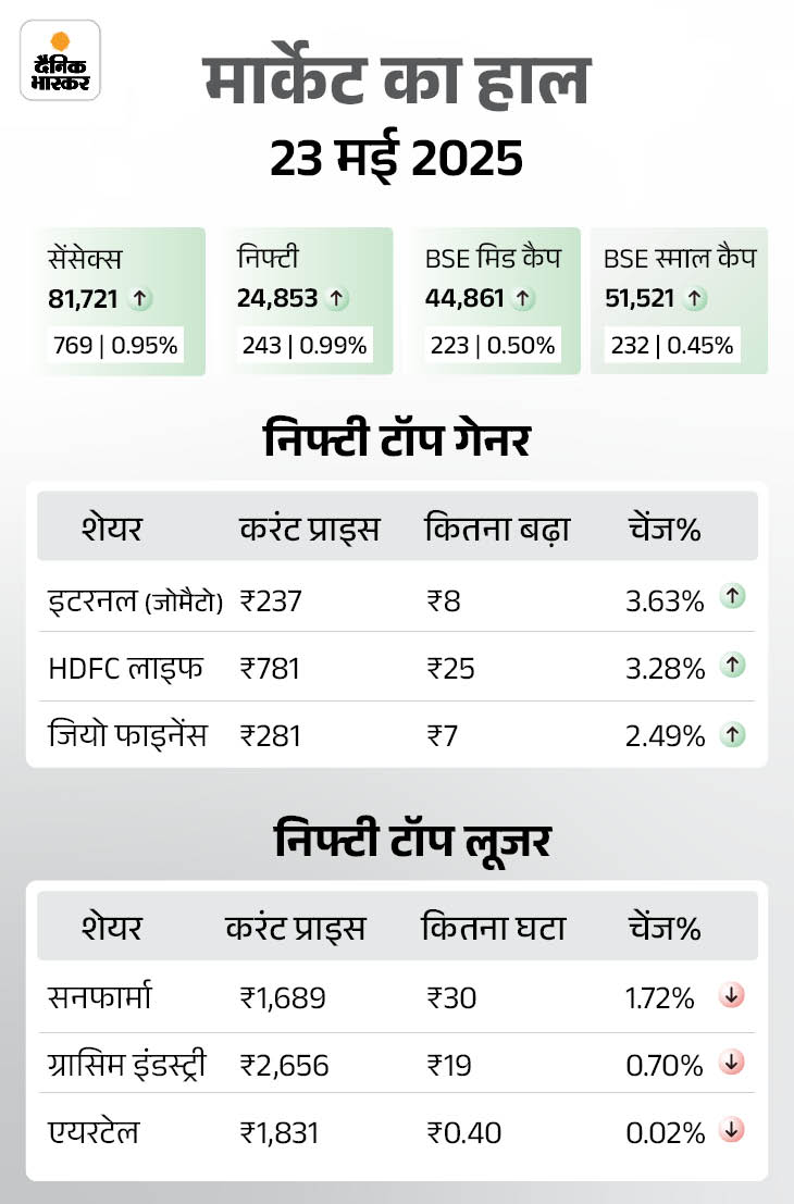 पिछले हफ्ते के आखिरी कारोबार दिन यानी शुक्रवार, 23 मई को सेंसेक्स 769 अंक चढ़कर 81,721 के स्तर पर बंद हुआ। निफ्टी में भी 243 अंक की तेजी रही, ये 24,853 के स्तर पर बंद हुआ।