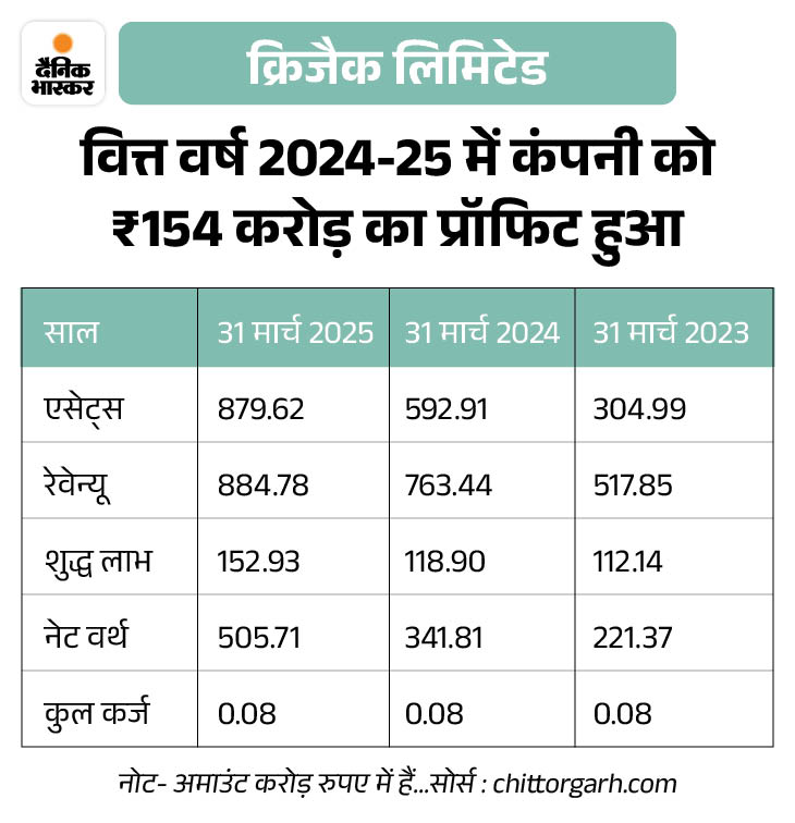 क्रिजैक लिमिटेड 860 करोड़ रुपए का IPO ला रही है। इसका IPO 2 जुलाई को ओपन होगा। निवेशक इस इश्यू के लिए 4 जुलाई तक बोली लगा सकेंगे। 9 जुलाई को कंपनी के शेयर बॉम्बे स्टॉक एक्सचेंज (BSE) और नेशनल स्टॉक एक्सचेंज (NSE) पर लिस्ट होंगे।