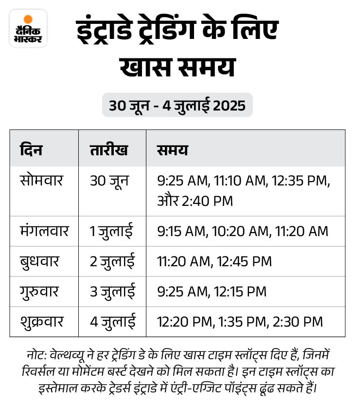 रिपोर्ट के मुताबिक, 30 जून की तारीख बाजार के लिए अहम है। इस दिन ट्रेडर्स को हाई-अलर्ट पर रहना चाहिए। निफ्टी के उच्च या निचले स्तर से ब्रेकआउट या ब्रेकडाउन बाजार की अगली दिशा तय कर सकता है। ट्रेडर्स इस दिन प्राइस एक्शन पर खास नजर रखें।