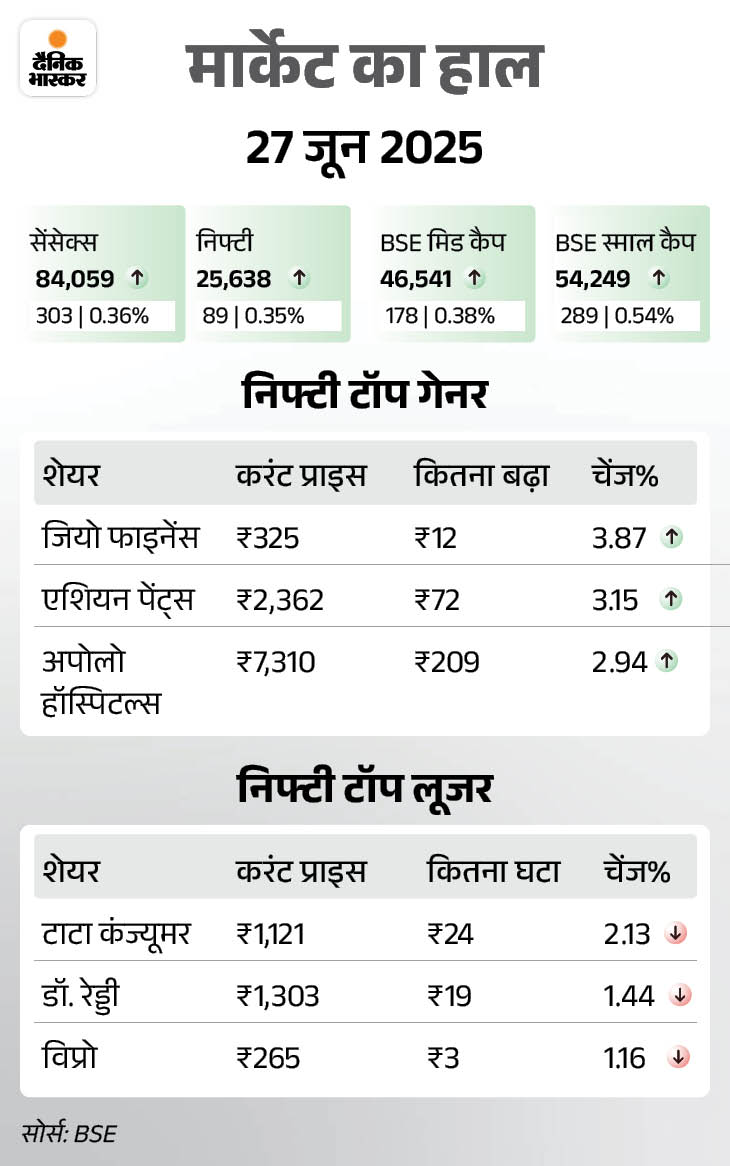 हफ्ते के आखिरी कारोबारी दिन यानी शुक्रवार, 27 जून को सेंसेक्स 303 अंक चढ़कर 84,059 के स्तर पर बंद हुआ। निफ्टी में भी 89 अंक की तेजी रही, ये 25,638 पर पहुंच गया।