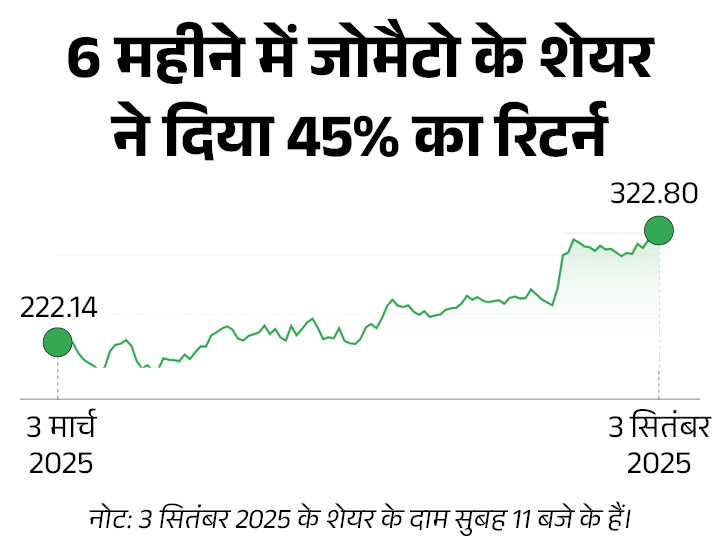 जोमैटो के शेयर ने एक साल में 30% का रिटर्न दिया जोमैटो का शेयर आज 323 रुपए पर फ्लैट कारोबार कर रहा हूं। कंपनी के शेयर ने इस साल अब तक करीब 17% का रिटर्न दिया है। वहीं बीते 6 महीने में 45% और एक साल में 30% का रिटर्न दिया है।