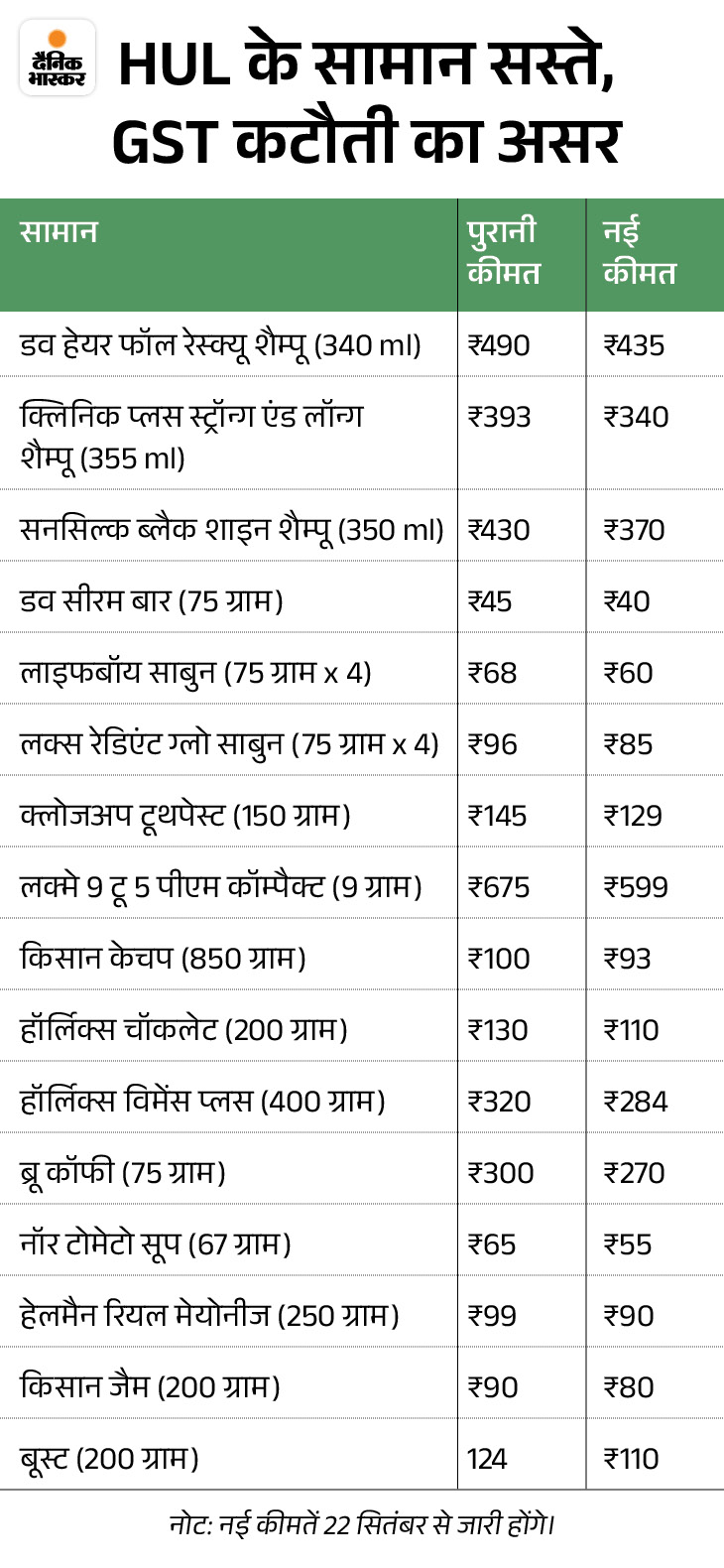 हिंदुस्तान यूनिलीवर लिमिटेड (HUL) ने अपने कई पॉपुलर प्रोडक्ट्स जैसे डव शैंपू, किसान जैम, हॉर्लिक्स, लक्स साबुन और लाइफबॉय साबुन के दाम में कटौती की है। इस कटौती के बाद कंपनी के सामान 15% तक सस्ते हो जाएंगे। ये बदलाव 22 सितंबर 2025 से लागू हो जाएगा।