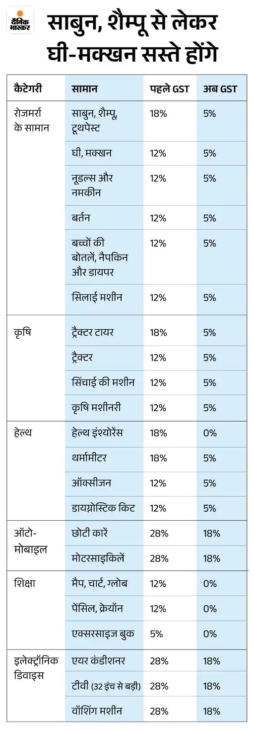 कई फूड आइटम्स जैसे UHT मिल्क, पनीर और जैम्स को या तो GST से छूट मिल गई या फिर 5% टैक्स स्लैब में डाल दिया गया। इसके अलावा साबुन, शैम्पू और टूथ पेस्ट पर GST को 18% से घटाकर 5% कर दिया है। सरकार ने साफ कहा कि ये टैक्स कटौती का फायदा कंज्यूमर्स तक पहुंचना है। इसी के चलते कंपनी ने दाम घटाने का फैसला किया है।
