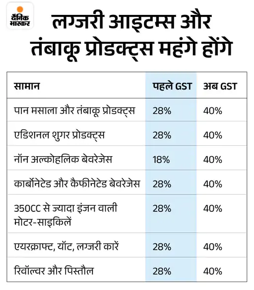 लग्जरी आइटम्स पर ज्यादा टैक्स लगेगा लग्जरी आइटम्स और तंबाकू प्रोडक्ट्स पर अब 28% की जगह 40% GST लगेगा। मध्यम और बड़ी कारें, 350cc से ज्यादा इंजन वाली मोटरसाइकिलें इस स्लैब में आएंगे। इससे इनकी कीमतें बढ़ सकती हैं।