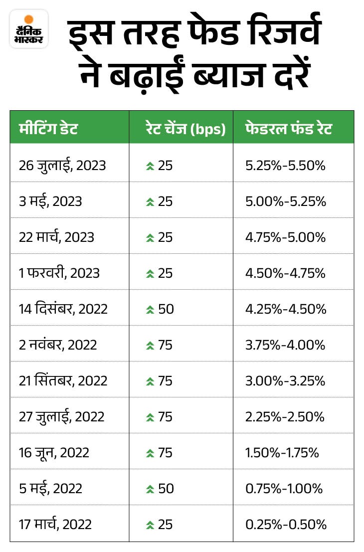 फेड ने मार्च 2020 के बाद सितंबर 2024 में इंटरेस्ट रेट्स घटाए थे। महंगाई कंट्रोल करने के लिए सेंट्रल बैंक ने मार्च 2022 से जुलाई 2023 के बीच 11 बार ब्याज दरों में इजाफा किया था।