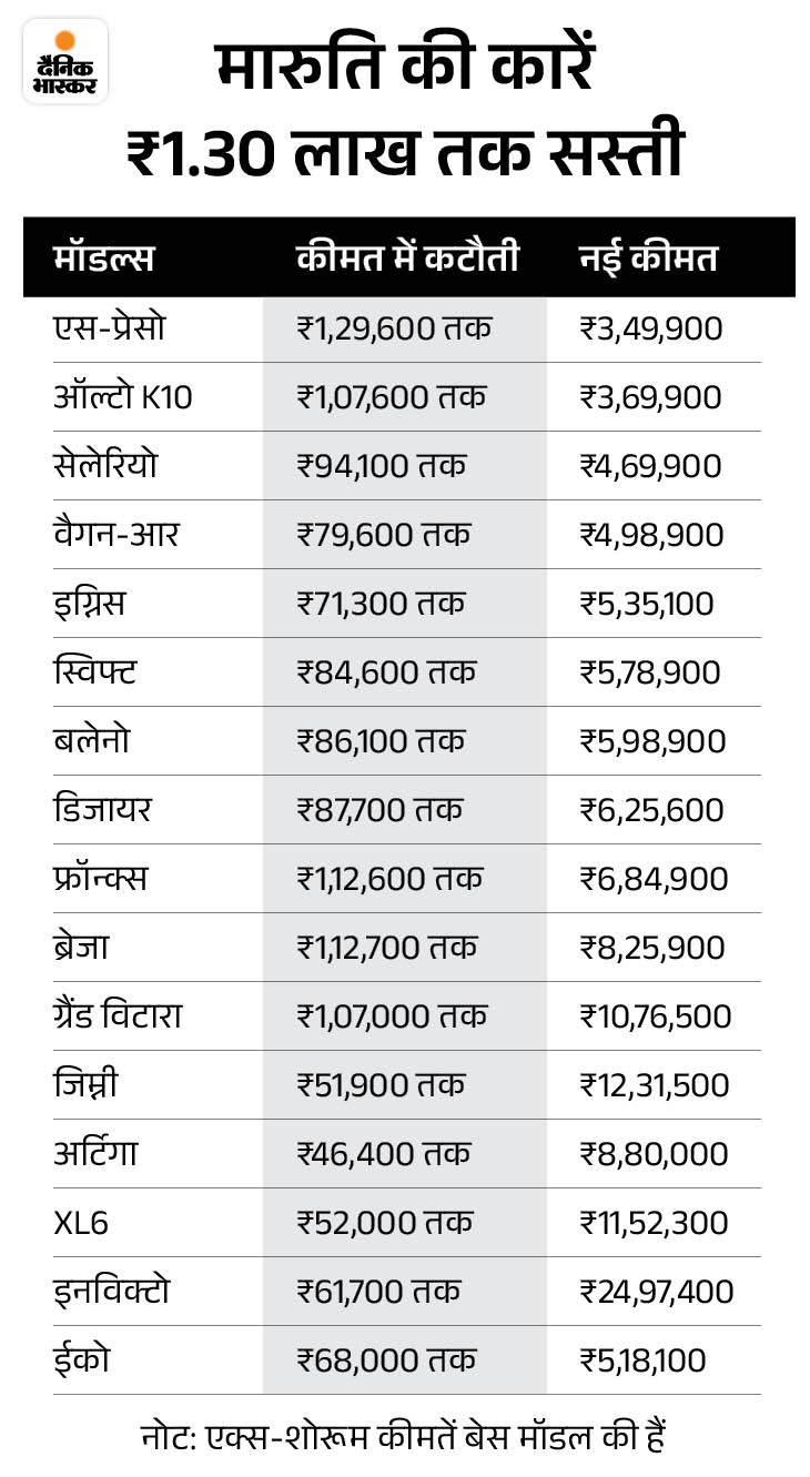 मारुति की छोटी कारें जैसे ऑल्टो K10, एस-प्रेसो, सेलेरियो, वैगनआर, स्विफ्ट, डिजायर, बलेनो, फ्रॉन्क्स और इग्निस पर 11% GST कट का फायदा मिलेगा। वहीं, मारुति अर्टिगा, XL6 और ग्रैंड विटारा 4 मीटर से ज्यादा लंबी हैं, इसलिए इन्हें सिर्फ 5% की छूट मिलेगी।