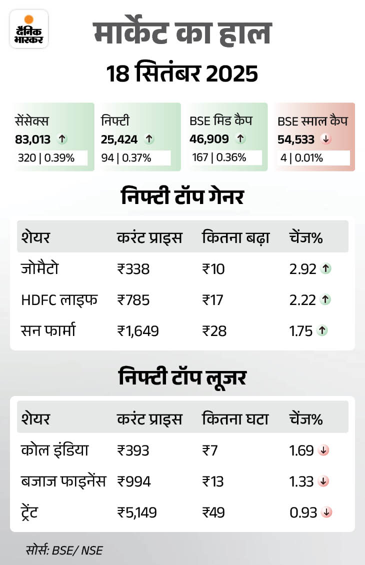 18 सितंबर को सेंसेक्स 320 अंक ऊपर 83,014 के स्तर पर बंद हुआ। निफ्टी में भी 93 अंक की तेजी रही, ये 25,424 के स्तर पर बंद हुआ।