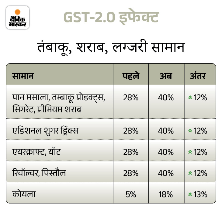 - सिन और लग्जरी सामान- सिगरेट, तंबाकू उत्पाद (जैसे गुटखा, बीड़ी, पान मसाला) ये अभी भी 28% + कंपनसेशन सेस पर रहेंगे, जब तक कंपनसेशन लोन क्लियर न हो जाएं। बाद में 40% में शिफ्ट होंगे।