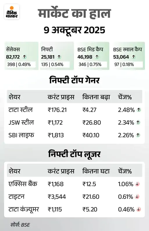 शेयर बाजार में कल यानी 9 अक्टूबर को तेजी रही थी। सेंसेक्स 398 अंक की बढ़त के साथ 82,172 के स्तर पर बंद हुआ। निफ्टी में भी 135 अंक की तेजी रही। ये 25,181 पर बंद हुआ।