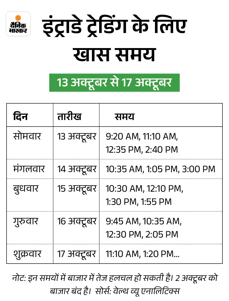 अहम तारीखों पर नजर: रिपोर्ट में 17 अक्टूबर, शुक्रवार को बाजार के लिए अहम तारीख बताई गई है। वेल्थ व्यू की रिपोर्ट के अनुसार इस दिन बाजार में तेज मोमेंटम दिख सकता है।