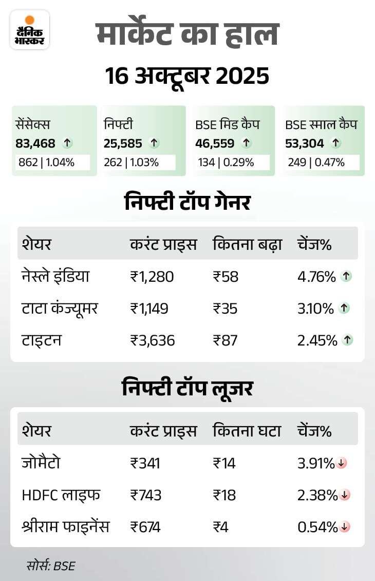 गुरुवार, 16 अक्टूबर को सेंसेक्स 862 अंक (1.04%) चढ़कर 83,468 पर बंद हुआ। निफ्टी में भी 262 अंक (1.03%) की तेजी रही, ये 25,585 पर बंद हुआ था।