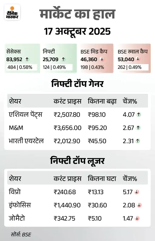 इससे पहले पिछले हफ्ते के आखिरी दिन यानी 17 अक्टूबर को भी शेयर बाजार में तेजी रही थी। सेंसेक्स 484 अंक चढ़कर 83,952 के स्तर पर बंद हुआ। निफ्टी में भी 124 अंक की तेजी रही, ये 25,709 के स्तर पर बंद हुआ।