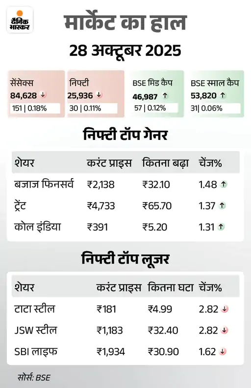 इससे पहले हफ्ते के दूसरे कारोबारी दिन यानी 28 अक्टूबर को शेयर बाजार में गिरावट रही। सेंसेक्स 151 अंक गिरकर 84,628 पर बंद हुआ। वहीं निफ्टी में भी 30 अंक की गिरावट रही, ये 25,936 पर बंद हुआ।
