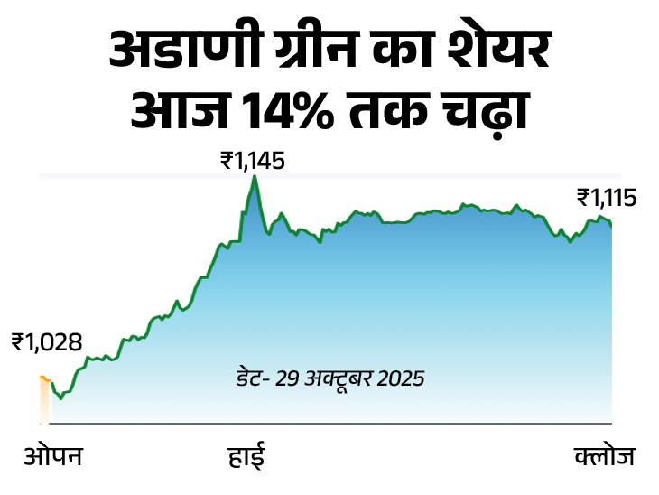 अडाणी ग्रीन एनर्जी का शेयर आज यानी 29 अक्टूबर को 14% तक चढ़ गया। क्योंकि कंपनी ने कल (28 अक्टूबर) को वित्त वर्ष 2025-26 की दूसरी तिमाही के नतीजे जारी किए जो, मार्केट के उम्मीदों के मुताबिक रहा।