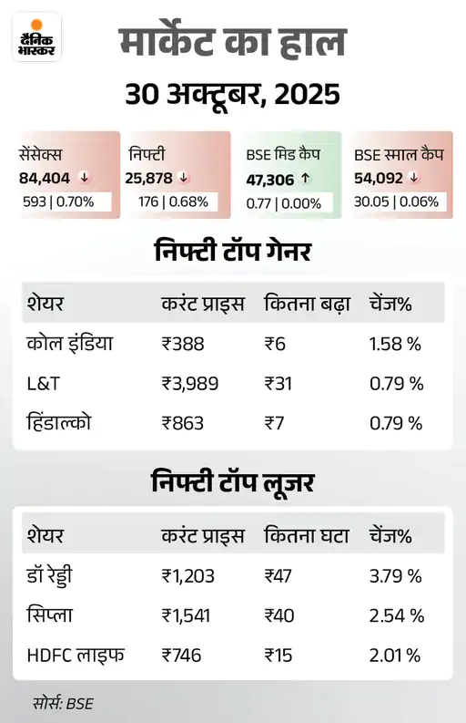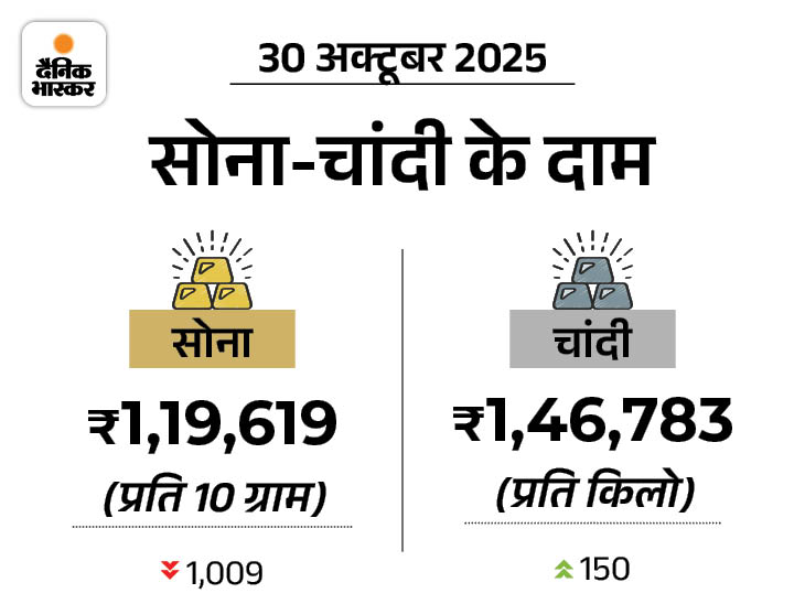 वहीं, सोना के दाम में 30 नवंबर को गिरावट रही। इंडिया बुलियन एंड ज्वेलर्स एसोसिएशन (IBJA) के अनुसार 10 ग्राम सोने की कीमत 1,009 रुपए गिरकर 1,19,619 रुपए हो गई है। बुधवार को सोने के दाम 1,20,628 रुपए प्रति 10 ग्राम थे।