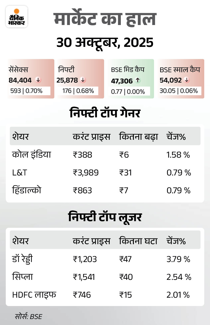 हफ्ते के चौथे कारोबारी दिन गुरुवार, 30 अक्टूबर को सेंसेक्स 593 अंक गिरकर 84,404 पर बंद हुआ। निफ्टी में भी 176 अंक की गिरावट रही, ये 25,878 पर बंद हुआ।