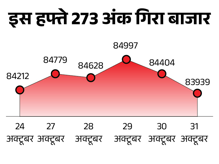 हफ्ते के आखिरी कारोबार दिन शुक्रवार, 31 अक्टूबर को सेंसेक्स 466 अंक गिरकर 83,939 पर बंद हुआ। निफ्टी में भी 155 अंक की गिरावट रही, ये 25,722 पर क्लोज हुआ। दिनभर के कारोबार के दौरान बाजार में 800 अंकों का उतार-चढ़ाव रहा।