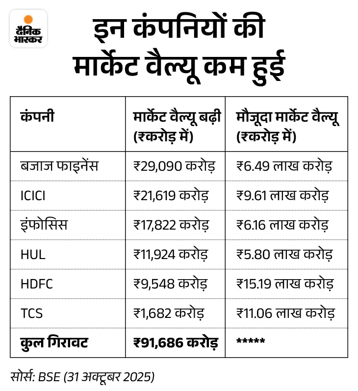 वहीं, टॉप-10 में से 6 कंपनी की वैल्यू ₹91,686 करोड़ गिरी है। इस दौरान बजाज फाइनेंस टॉप लूजर रही। कंपनी की वैल्यू इस दौरान ₹29,090 करोड़ कम होकर ₹6.49 लाख करोड़ पर आ गया है। वहीं, ICICI बैंक ने इस दौरान अपनी वैल्यूएशन ₹21,619 करोड़ गंवाई और अब यह ₹9.61 लाख करोड़ रह गया है।