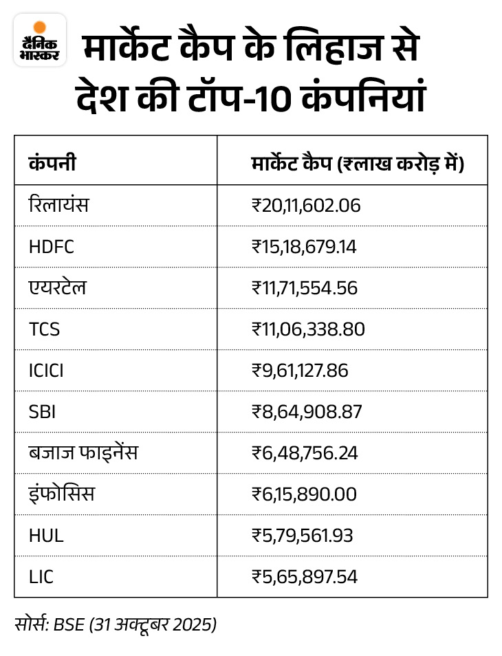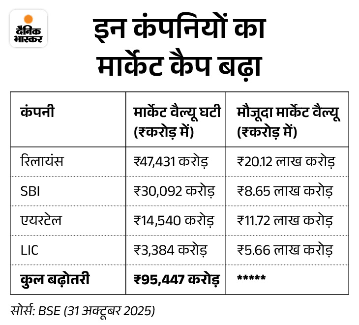 मार्केट वैल्यूएशन के हिसाब से देश की 10 सबसे बड़ी कंपनियों में से 4 की वैल्यू इस हफ्ते के कारोबार में ₹95,447 करोड़ बढ़ी है। इस दौरान देश की सबसे बड़ी प्राइवेट सेक्टर कंपनी रिलायंस इंडस्ट्रीज टॉप गेनर रही।