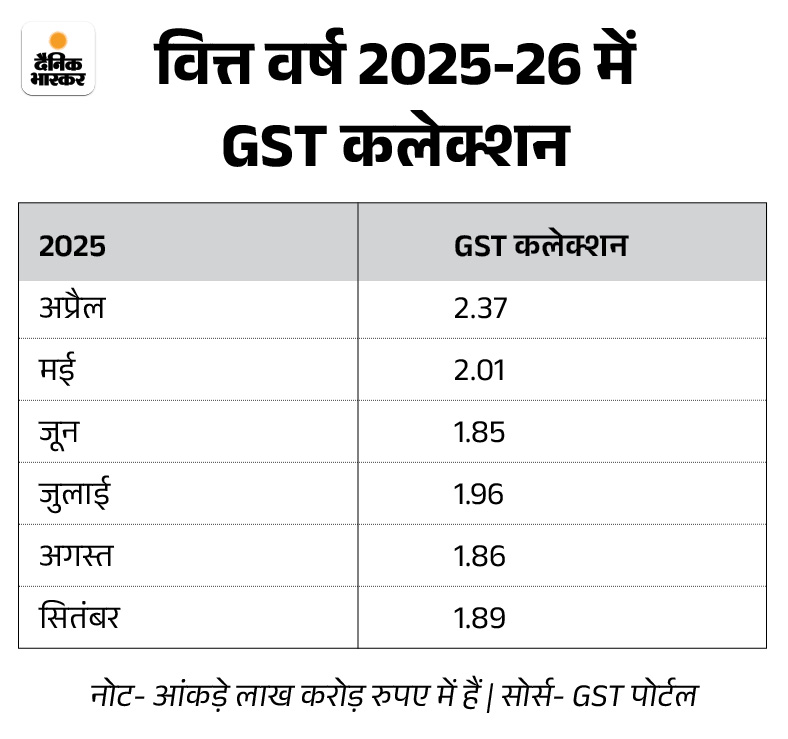 सितंबर में सालाना 9.1% की बढ़ोतरी के साथ 1.89 लाख करोड़ रुपए GST वसूला गया था। इससे पहले अप्रैल 2025 में रिकॉर्ड 2.37 लाख करोड़ रुपए और मई में 2.01 लाख करोड़ रुपए GST के रूप में जुटाए गए थे।