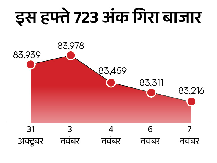हफ्ते के आखिरी कारोबारी दिन शुक्रवार, 7 नवंबर को सेंसेक्स 95 गिरकर 83,216 पर बंद हुआ। निफ्टी में भी 17 अंक की गिरावट रही, ये 25,492 के स्तर पर बंद हुआ। कल बाजार में 600 अंक तक गिरावट रही थी।