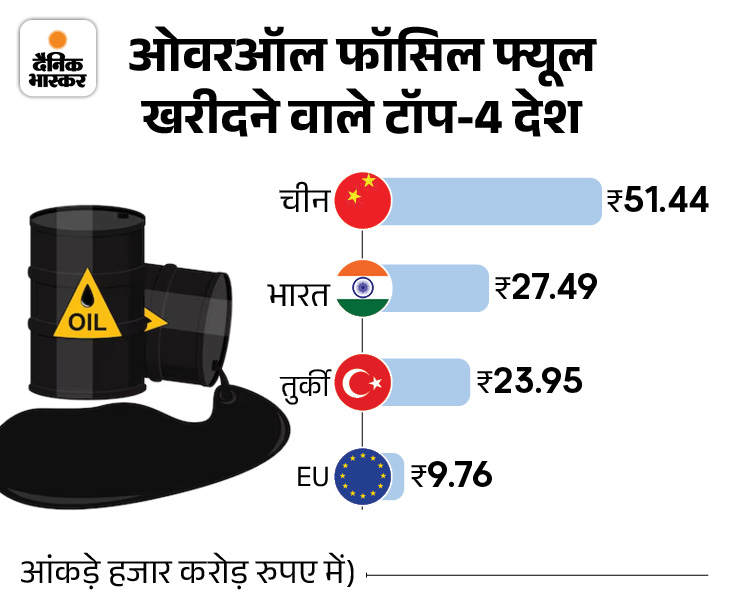 CREA के अनुसार, चीन 3.7 बिलियन डॉलर (करीब 32.82 हजार करोड़ रुपए) के इम्पोर्ट के साथ पहले नंबर पर रहा। कुल मिलाकर, रूस से भारत का फॉसिल फ्यूल आयात 3.1 बिलियन डॉलर (करीब ₹27.49 हजार करोड़) पहुंच गया है, जबकि चीन का कुल आंकड़ा 5.8 बिलियन डॉलर (करीब ₹51.44 हजार करोड़) रहा। अमेरिकी प्रतिबंध का असर दिसंबर के आंकड़ों में दिख सकता है, लेकिन भारत अभी भी खरीदारी जारी रखे हुए है।