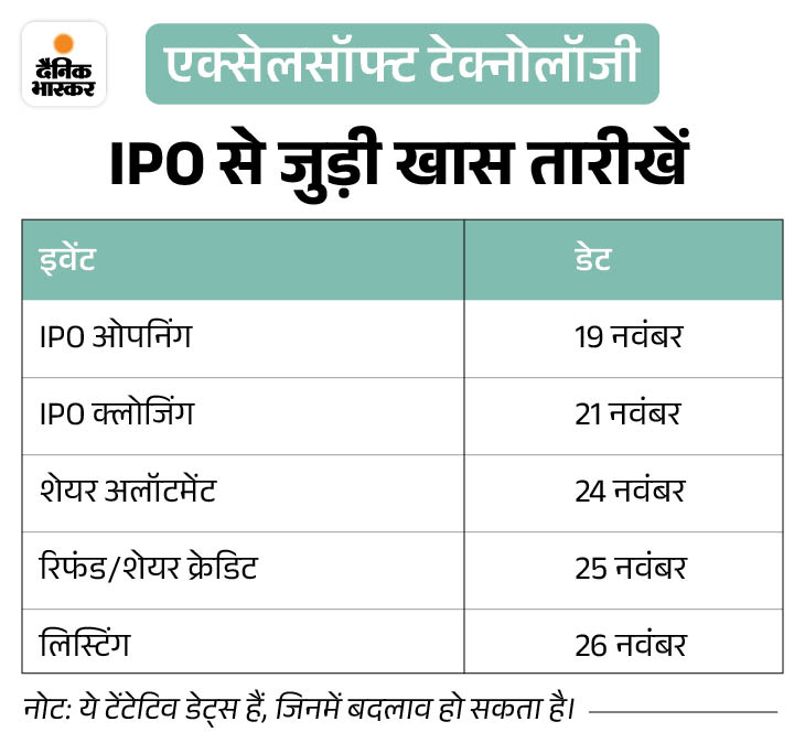 19 नवंबर से ओपन होगा एक्सेलसॉफ्ट टेक्नोलॉजी का IPO एक्सेलसॉफ्ट टेक्नोलॉजी का IPO 19 नवंबर को खुलेगा और 21 नवंबर को बंद होगा। यह बुक-बिल्ट इश्यू ₹500 करोड़ का है, जिसमें 1.50 करोड़ शेयरों का फ्रेश इश्यू ₹180 करोड़ का है। साथ ही, 2.67 करोड़ शेयरों का ऑफर फॉर सेल (OFS) ₹320 करोड़ का होगा। प्राइस बैंड ₹114 से ₹120 प्रति शेयर रखा गया है।