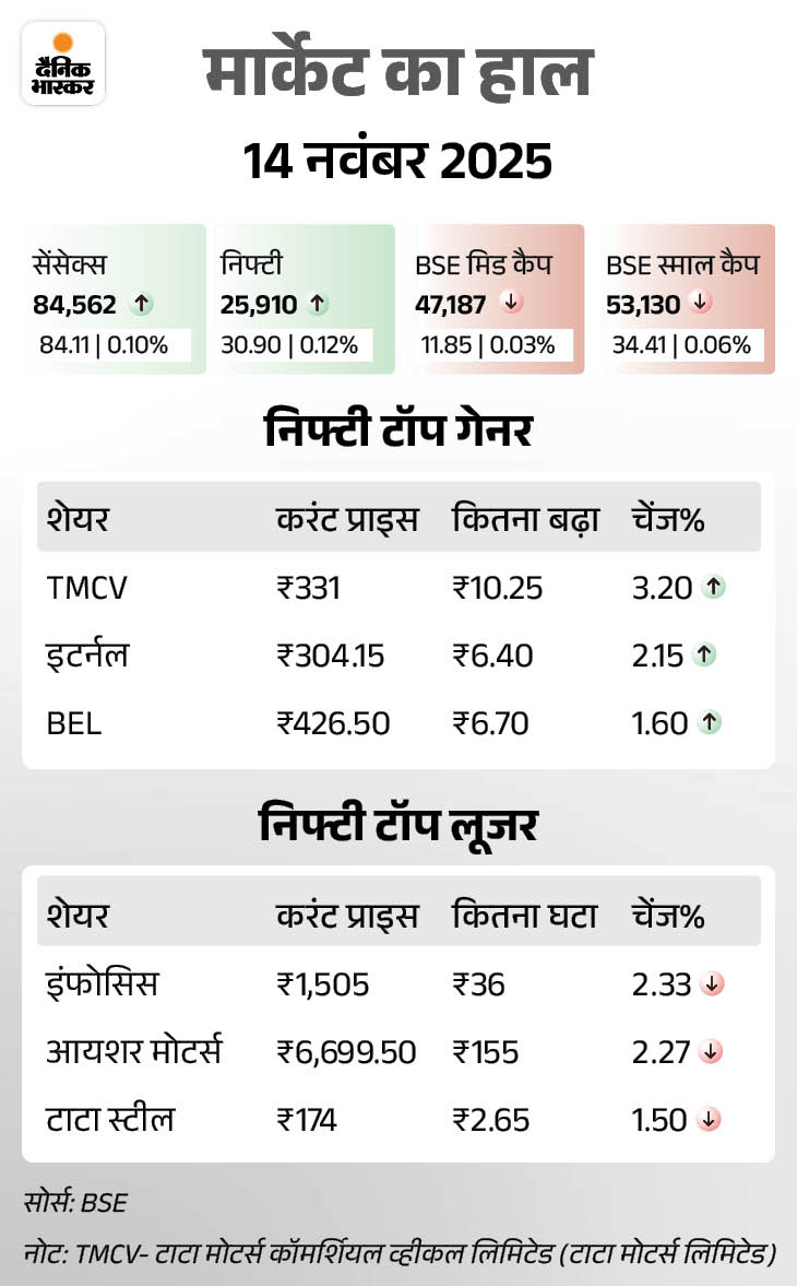 शुक्रवार को बाजार में रही थी तेजी इससे पहले शुक्रवार यानी 14 नवंबर को सेंसेक्स 84 अंक चढ़कर 84,562 पर, जबकि निफ्टी 31 अंक ऊपर 25,910 पर क्लोज हुआ था। PSU बैंक में 1.17%, फार्मा में +0.59 और बैंकिंग सेक्टर में +0.15% की तेजी रही थी।